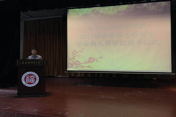 毕业典礼在全体师生共唱国歌中开始,2017届研究生代表黄珊艺同学总结自己收获满满的研究生生活,感谢学校、学院和老师们,表达了自己对今后学习生活的美好希冀。甘满堂教授作为导师代表对毕业生们提出今后工作、生活的三点希望,同时嘱咐同学们多回母校看看。最后,吴兴南院长表达了对毕业生们的美好祝福和亲切鼓励。毕业典礼最令人激动的学位授予仪式在毕业歌声中进行,毕业生代表依次上台,由吴院长进行拨穗仪式和授予学位证书。
