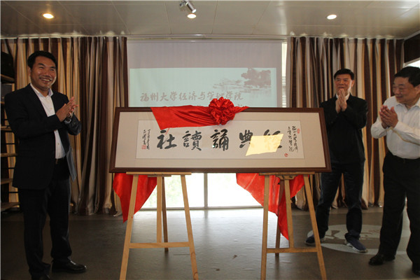 新闻中心讯/在第22个“世界读书日”到来之际,4月23日上午,作为我校承办的2017年福建省高校教职工首届读书节活动之一的经济与管理学院师生经典诵读社成立仪式在学院二楼“书咖”顺利举行。莅校参加2017年福建省高校教职工首届读书节活动的福建省人大常委会副主任、省总工会主席张广敏、福建新华发行集团总经理吴志明及我校党委书记陈永正等领导为经典诵读社揭牌。经济与管理学院院长唐振鹏教授为省逸仙艺苑副理事长兼秘书长丘占少、省逸仙艺苑鼓楼书委会副会长、书法家蔡建设及经济与管理学院05届校友、福州弘翼书院创办人陈明熙等三位社团指导老师颁发聘书。经典诵读社首任社长、退休教师郑声锵老师与常务副社长卓惠敏同学分别在成立仪式上发言,向现场师生分享了成立经典诵读社的初衷及今后开展活动的思路。我校学生处主持工作副处长魏金明为诵读社赠书。经济与管理学院党委娄东生书记在致辞中指出,经典诵读社的成立,为师生一起诵读经典、学习中华优秀传统文化提供了一个平台,必将能为我校开展中华优秀传统文化育人工作、继承和发展中华民族优秀传统文化贡献一份力量。活动结束后,经济与管理学院05届校友、福州弘翼书院创办人陈明熙先生为师生们做《穿西装学国学》的国学专题讲座,反响热烈。