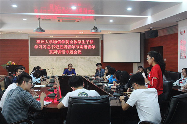 新闻中心讯/5月4日,福州大学物信学院学生干部学习习总书记五四青年节寄语青年系列讲话专题会议在物信学院祥联厅顺利举行。在院团委副书记徐红梅老师的主持下,两委学生会学生干部围绕习总书记在中国政法大学的讲话内容展开热议。