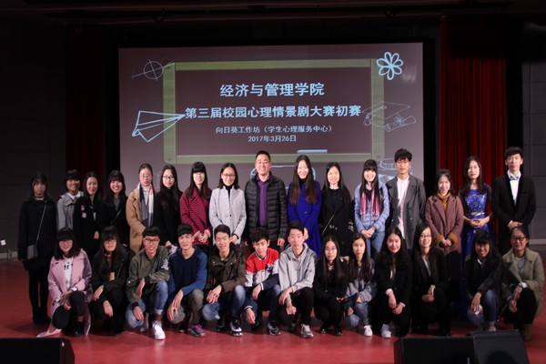 新闻中心讯/3月26日下午,由经济与管理学院向日葵工作坊(学生心理服务中心)主办的院第三届校园心理情景剧大赛初赛在博学厅拉开帷幕。经济与管理学院团委书记赵燕松老师,院团委副书记、国家三级心理咨询师夏丽君老师,院团委副书记牛秋月老师,国家三级心理咨询师章小妹老师、蒋麓老师等出席活动并担任评委。