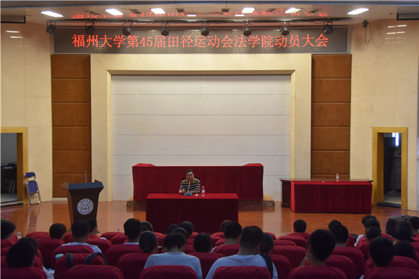 新闻中心讯/10月27日下午,福州大学第45届田径运动会法学院动员大会在模拟法庭顺利举行。福州大学法学院党委副书记黄侨彬、团委书记董晨燕以及法学院的全体运动员们参与了此次会议,并由董晨燕老师担任此次大会主持人。