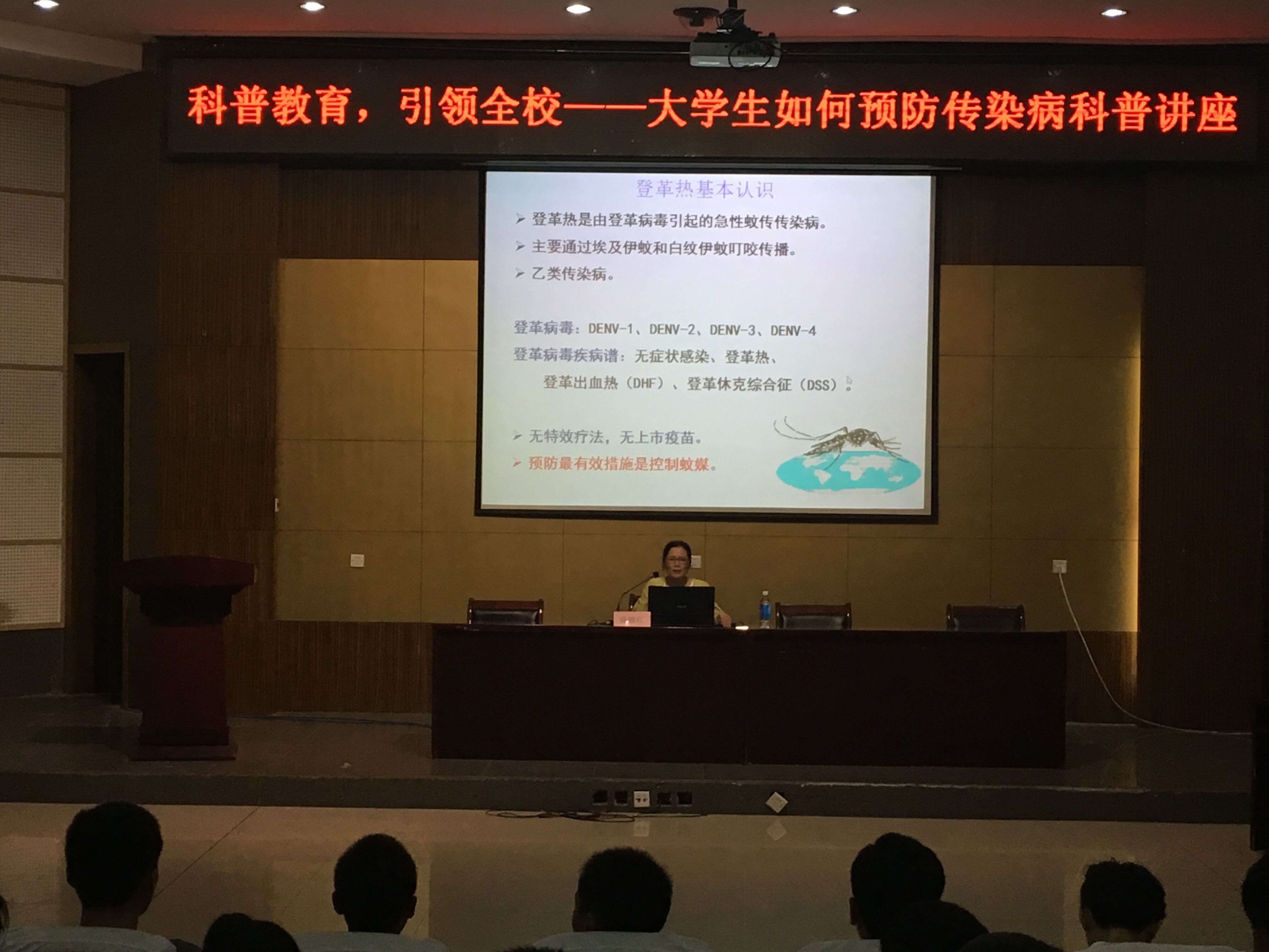 讲座之前,江小敏老师首先说明了开展登革热防治科普工作的必要性和重要性。陈敏红主任以多组数据分别从1、登革热在福州的疫情。2、登革热的基本知识:传染源(登革热患者、隐性感染者、带病毒动物是本病主要传染源和宿主),传播途径(登革热在我国的主要传播媒介为埃及伊蚊和白纹伊蚊),预防措施(控制传染源、切断传播途径、提高人群抗病力)等。3、登革热的临床表现三个方面对同学们进行详细的科普讲解。之后,陈敏红主任就蚊虫的种类,生长史,幼虫滋生地类型向同学们传授了相关的预防措施。同学们经过一下午生动易懂的培训,对登革热病有了一定的认识,并学会了许多预防登革热以及其他传染病的预防措施。最后江小敏老师进行了总结,希望同学们做好打扫宿舍卫生,做好相关预防准备工作,并及时汇报处理发病病例。