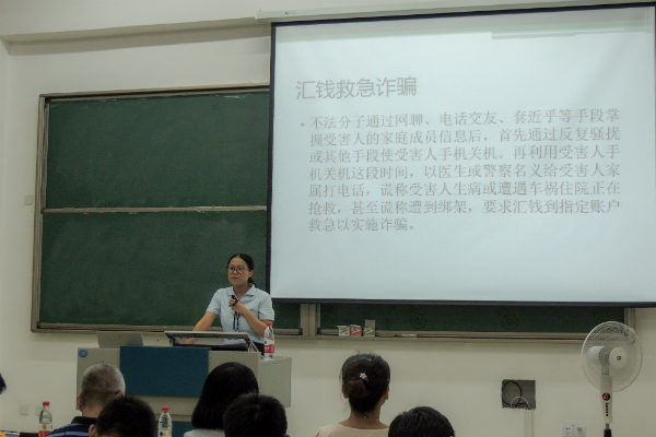 讲座伊始,李美玲用时下“徐玉玉事件,利用王宝强名义的短信诈骗”等几种新型金融诈骗案例入手,带同学们走进金融诈骗过程。随后李美玲从“什么是金融诈骗?”“金融诈骗有什么危害?”“金融诈骗的常见手段”“如何防范金融诈骗?”等四个方面系统地讲解了金融诈骗,为同学们树立起了基本的网络安全意识和防诈骗意识。讲座末了,同学们纷纷分享身边的相关事例,建设银行的工作人员也都给出了相应的解决防范方案,让同学们对金融诈骗和防金融诈骗都有了更深层的了解。