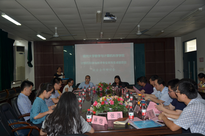 新闻中心讯/ 7月6日上午,数学与计算机科学学院召开计算机科学与技术专业卓越项目校企合作研讨会,学院党委庄晨忠书记、谢晓默副书记,王美清副院长出席会议,北京福富软件技术股份有限公司、福建星网锐捷通讯股份有限公司、福建榕基软件股份有限公司、福大天厚基金互联网金融研究院、福建北卡科技有限公司等多家企业相关负责人、学院部分系主任、辅导员和教学秘书参加会议,会议由王美清副院长主持。