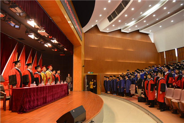 毕业典礼在庄严的国歌中拉开序幕。教师代表、硕士生导师何郁冰副教授发言,他用祝贺、感谢、期望三个词表达了他的心情。毕业生代表吴文强同学、杨天雪同学回忆了研究生三年时光,并代表所有毕业生向领导和老师们表达最崇高的敬意及最衷心的感谢。唐振鹏教授向毕业生表示祝贺,并提出几点希望:第一,志存高远,努力上进,希望大家都能树立远大的志向;第二,自信立身,勇担责任,自信勇敢地面对人生的挑战;第三,开阔胸怀,跳出小我,在时代潮流中彰显责任与担当;第四,包容处事,发扬美德。最后,唐教授祝福每一名毕业生能够怀揣梦想,快乐地学习与工作,幸福地生活。