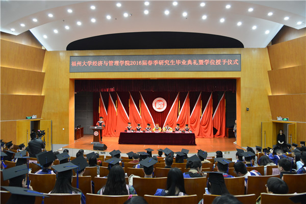 新闻中心讯/3月26日上午,经济与管理学院2016届春季研究生毕业典礼暨学位授予仪式在图书馆明德厅隆重举行。经济与管理学院党委书记娄东生研究员、主持工作副院长唐振鹏教授、院党委副书记翁穗平副研究员、副院长叶先宝教授、副院长陈可嘉教授、院长助理卢长宝教授出席本次毕业典礼。毕业典礼由院党委陈伟民副书记主持。