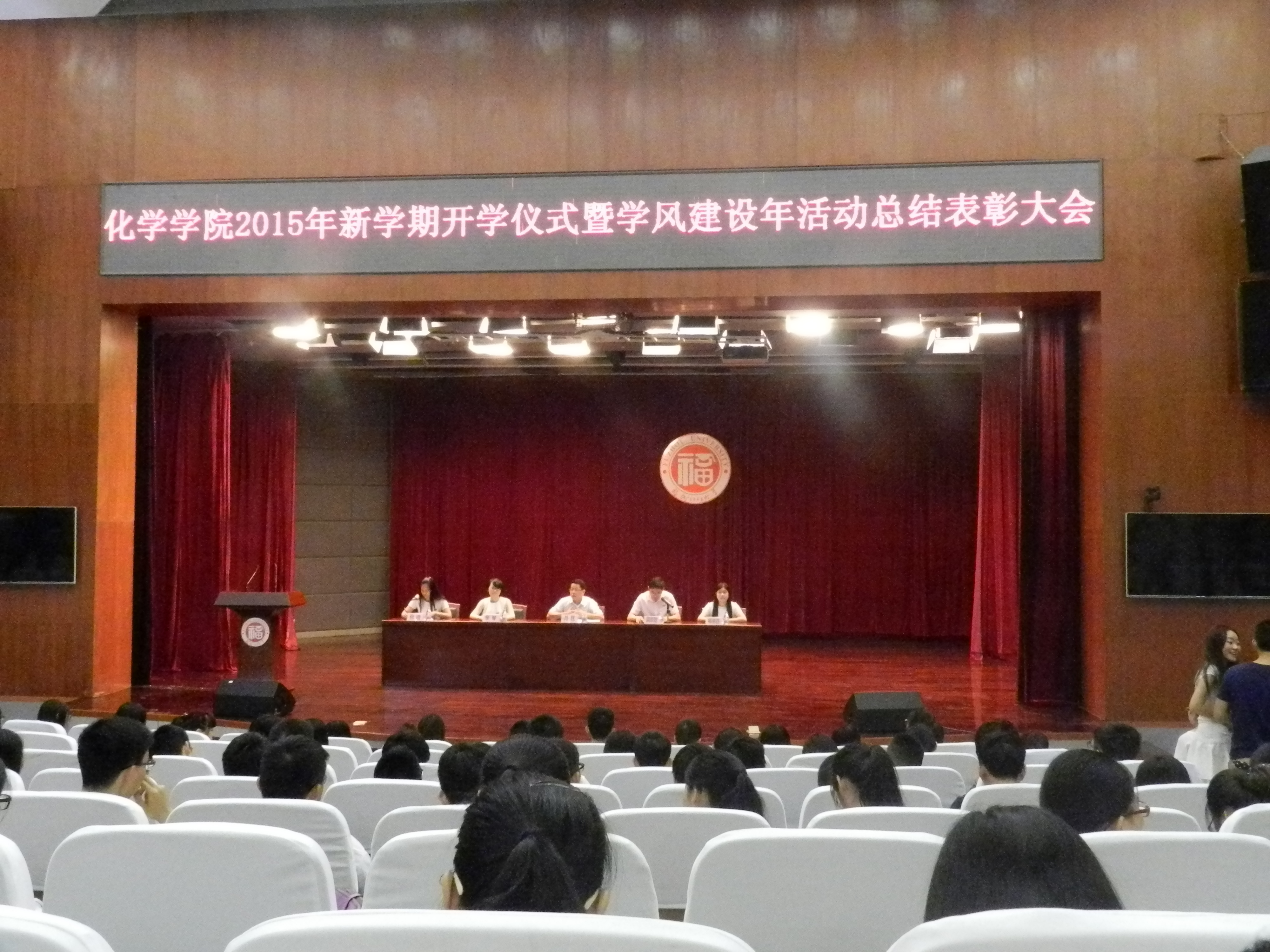新闻中心讯/8月30日上午,化学学院2015年新学期开学仪式暨学风建设年活动总结表彰大会在图书馆博学厅(旗山校区)隆重举行。学院党委副书记刘旺、团委书记蓝荣聪、本科生各年级辅导员等出席大会。