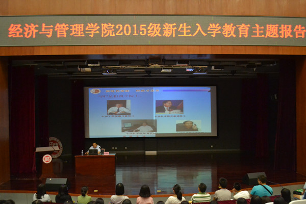 新闻中心讯/莘莘学子入校园,教育先行迎未来。9月8日晚19时,经济与管理学院新生入学教育主题报告之“担时代责任,立成才之志”在图书馆博学厅圆满举办,经济与管理学院2015级新生踊跃参加,学院党委陈伟民副书记担任主讲人。
