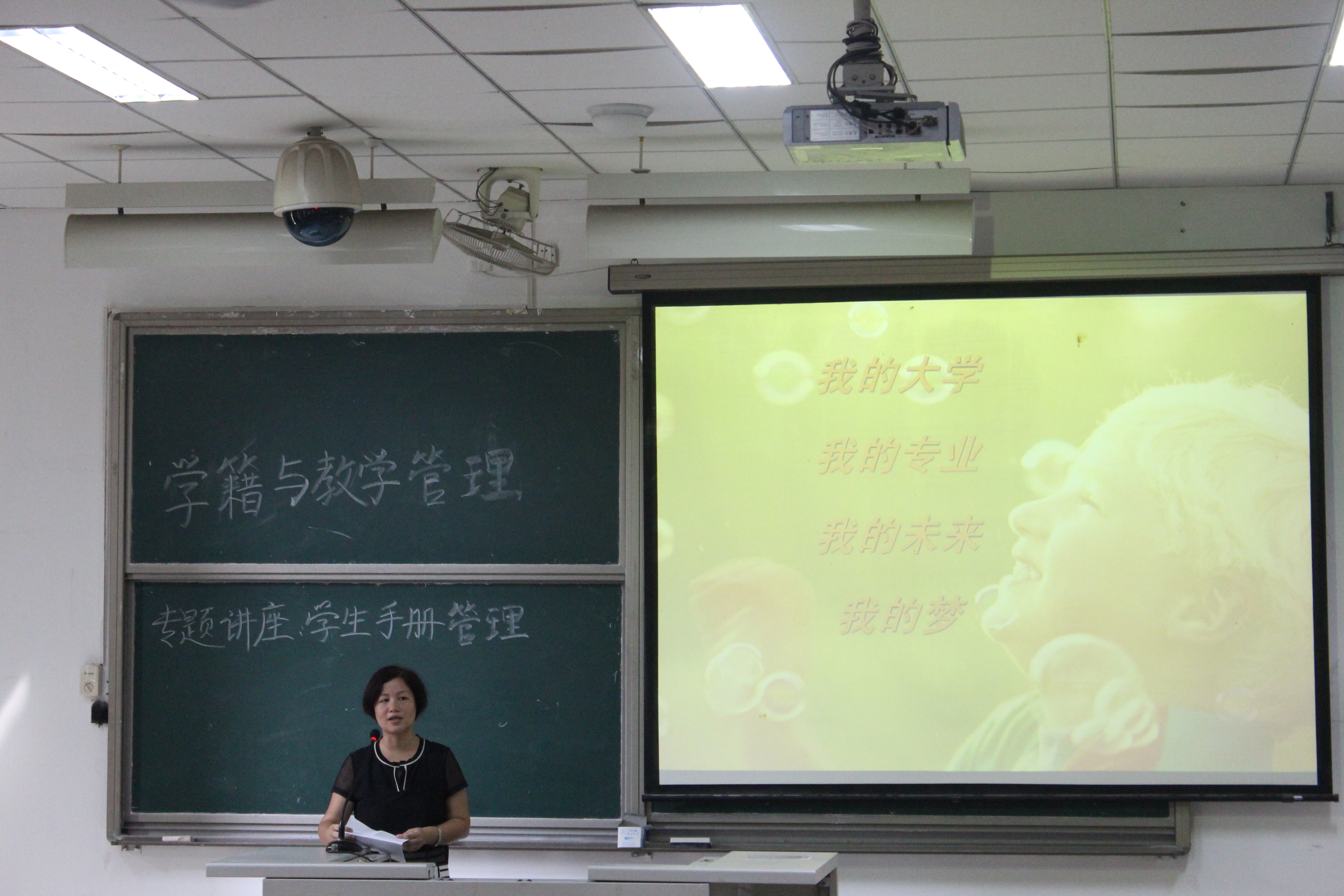 9时,讲座如期开始。梁桂芳老师首先祝贺在坐的各位新生顺利进入大学,并为新生讲解她眼中的大学:大学被誉为知识工厂,社会的知识需求、人力需求乃至思想需求,都在为大学这个工厂下订单。梁桂芳老师提出,希望同学们能够约束自己,在适应的过程中时刻提醒自己来大学是干什么的。