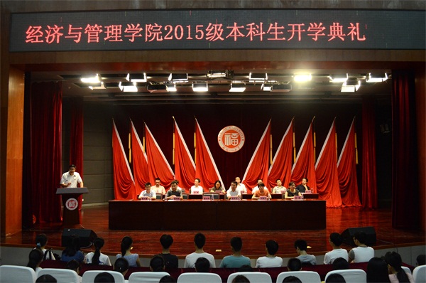 新闻中心讯/9月9日下午,经济与管理学院2015级本科新生开学典礼在图书馆博学厅举行。经济与管理学院党委娄东生书记,主持工作副院长唐振鹏教授,党委翁穗平副书记,许萍、陈可嘉副院长及各系主任出席了本次典礼。经济与管理学院2015级全体新生参加了本场典礼。本次开学典礼由学院党委陈伟民副书记主持。