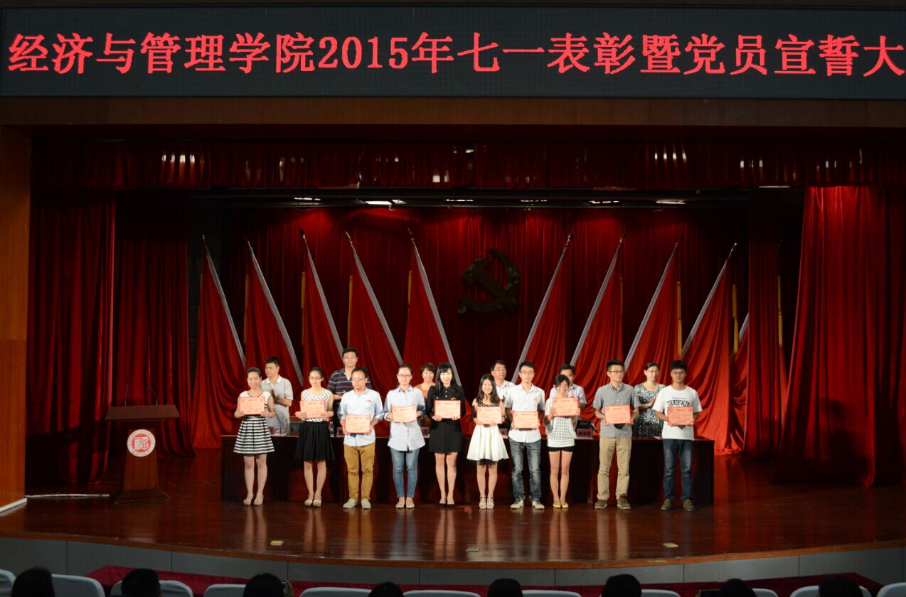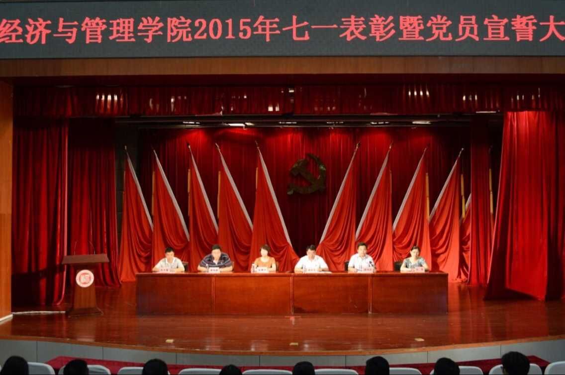 新闻中心讯/7月1日下午,经济与管理学院2015年七一表彰暨党员宣誓大会在博学厅顺利举行。莅临本次大会的领导有经济与管理学院党委书记娄东生,院党委副书记翁穗平,副院长唐振鹏,副院长许萍、陈可嘉。院党委副书记陈伟民担任此次大会的主持人。