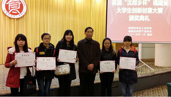 新闻中心讯/2014年9月至12月,由福建省食品工业协会、福建省油茶产业协会主办,福建农林大学食品科学学院、福建沈郎生物科技集团有限公司联合承办的“沈郎乡杯”首届福建省大学生创新创意大赛”活动在我省各有关高校全面展开。此次比赛共评选出一等奖6名,二等奖10名,三等奖16名,并于2015年1月9日下午,在福州市举行颁奖典礼。