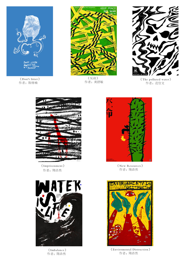 隋浩然的海报作品《lmprisonment》、《New Resources》、《lmbalance》、《Enviromengtal Disteuction》(指导老师:黄志雄);