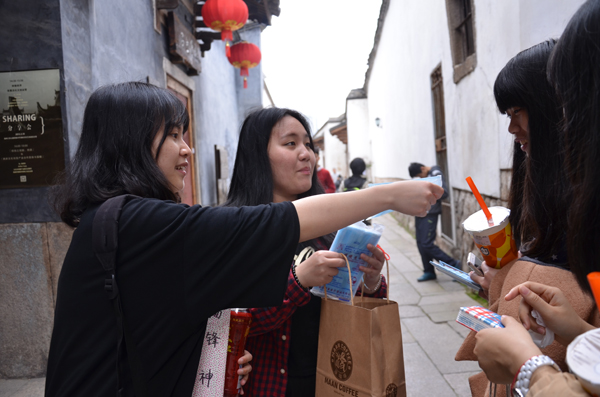 比赛共有十支队伍,近百余人在三坊七巷景区内进行DIY环保袋、纸巾、饮料的义卖。同学们身披绶带,向过往的行人解释自己的比赛,“购物袋是我们自己动手做的,卖商品所得也是作为公益基金。”可爱的草莓购物袋很快得到了路人的喜爱,每支队伍都竭尽全力。