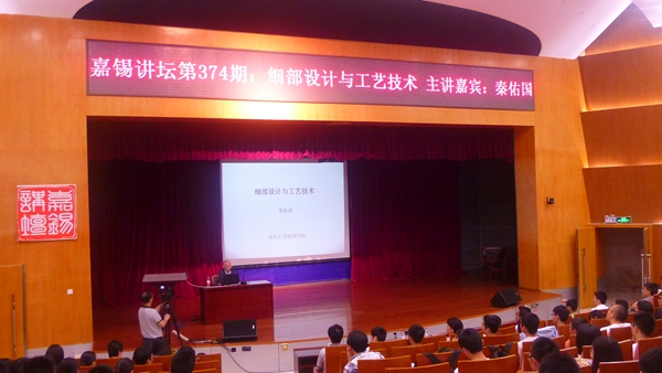 秦教授首先阐明了本次主题的意义。他认为长期以来中国的建筑设计,就建筑艺术而言,只着重空间与形式的创作,却忽略了细部设计,加之施工建造中,工艺技术的粗糙,使得中国建筑“不能近看、不能细看,不耐看”。老师以此为出发点引出了《细部设计》这门课程的设立。随后以建筑大师密斯·凡·德·罗说过一句话:“建筑开始于两块砖被仔细地连接在一起。”开始讲座。