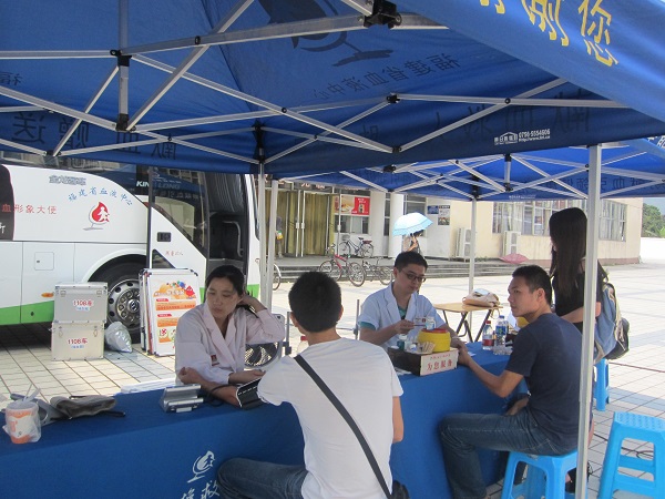 9点50分左右,带有“献血救人,助人益己”字样的献血车驶入了校门。而后,宽大的蓝色帐篷在丁香园前搭起,桌椅一一摆好,一切准备就绪。令人感动的是,活动开始之前,已有同学早早来到,等候献血。在医务人员和工作人员的温馨接待和引导下,献血的同学先是在蓝色帐篷下进行登记,抽验血型,填写相关表格,然后进入献血车内进行献血。