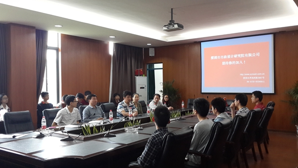 新闻中心讯/2014年4月20日早上,深圳市政设计研究院有限公司总裁等多位领导,于建筑学院213会议室召开了2014校园招聘宣讲会。出席本次招聘会的有建筑学院院长关瑞明教授,辅导员林舒老师与建筑学院部分高年级学生。
