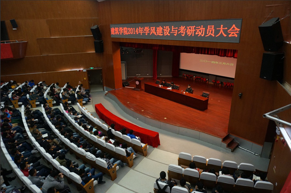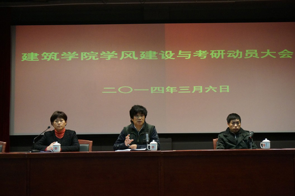 新闻中心讯/为了全面贯彻党的十八大和十八届三中全会精神,落实党的第二批群众路线实践活动,福大建筑学院于3月6日下午,在博学厅召开了2014年学风建设与考研动员大会。院党委书记陈小辉副教授、院长关瑞明教授、党委副书记张红副教授、院团委书记陈展飞老师、辅导员权斌老师以及林舒老师出席本次大会。