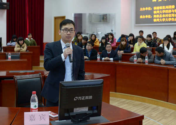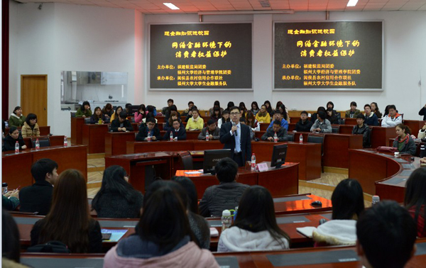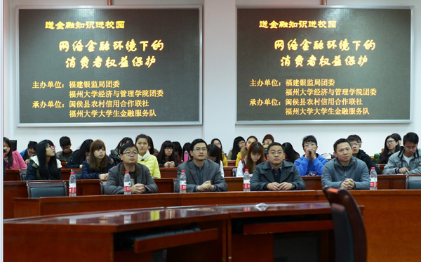 新闻中心讯/3月8日上午,由福建银监团委以及经济与管理学院团委携手主办的 “网络金融环境下的消费者权益保护”讲座在经管中楼418交易模拟实验室举行,福建银监局法规处副处长蔡军龙、福建银监局法规处团委副书记唐凌、闽侯县农村信用合作联社团委书记徐萌,浦发银行零售业务部经理王建利以及经济与管理学院团委书记赵燕松出席本次讲座,王建利经理担任主讲嘉宾。