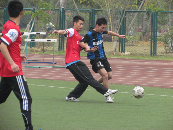 本次足球赛由物信学院体育部主办,进入决赛的两只球队都是在小组淘汰赛的严格考验下脱颖而出的球队。上半场,身穿蓝色球衣的信通队率先敲开对方的球门,可惜越位无效,此后比赛进入僵持状态,再无进球。下半场,异地再战,信通队越战越勇,以近距离射门和角球直接得分的方式连得两分,激起了场边观众的阵阵欢呼。而身穿红色球衣的电科队面对0-2的落后局势也不甘示弱,奋起直追,很快便追回一球,将比分带到1-2。直到终场哨吹响前双方都没能再得分。信通队最终以2-1胜出,获得了本届物信学院足球赛总决赛的冠军。