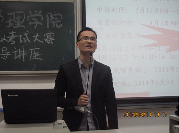 新闻中心讯/3月13日晚,由经济与管理学院学生会就业服务部、公共管理系职业与发展协会、物流系实践部与福建华图教育联合举办的“经济与管理学院首届公务员模拟考试大赛”开幕式暨“解析2014年考公趋势讲座”在文一405举行。出席本次活动的嘉宾有:经济与管理学院章先彪、吴东东、章小妹等老师。