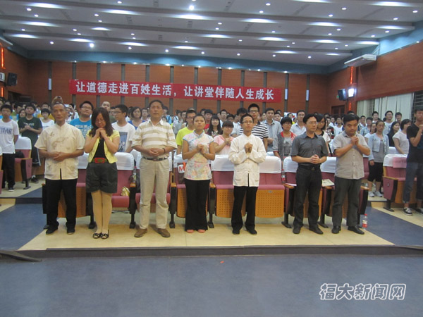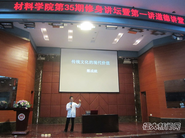 新闻中心讯/为了弘扬我国优秀传统文化,切实提高同学们的思想道德素质,9月29日晚,材料学院在嘉锡厅开展第35期修身讲坛暨第一讲道德讲堂。明德小学创办人、举办过多次传统文化讲座和公益论坛的郑成统老师,这次受到材料学院领导的邀请,特来为同学讲解传统文化。出席此次讲座的有校党委宣传部副部长刘朝晖,材料学院党委副书记陈伟民,人文学院薛美秀老师,法学院郑艺群老师,辅导员卢杰、王怡、谭晓兰老师。材料学院温娜博士主持此次讲座。