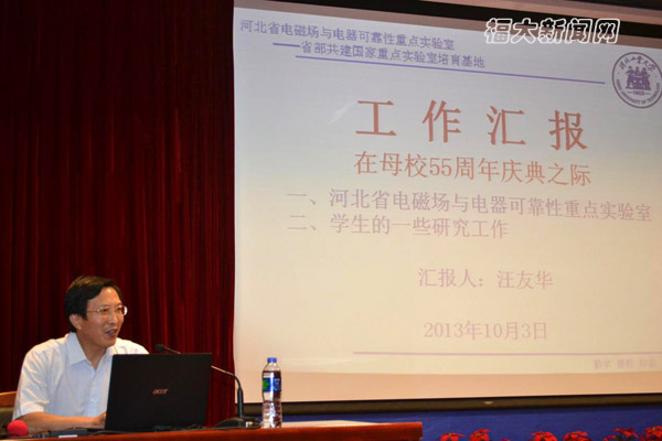 随后,汪友华校友作为电磁场与电器可靠性研究领域的专家,围绕电磁场与电器可靠性问题,汪先生从工程电磁场的综合效应、电器可靠性理论与检测方法、磁材料特性和研究方法以及生物电磁理论与技术几个方面进行了详尽讲解。在学术报告过程中,汪友华校友不时结合自身经历,告诫同学们如何做事、做人、做学问。汪友华校友灵活的思维和独到的见解获得了在场师生的阵阵掌声。