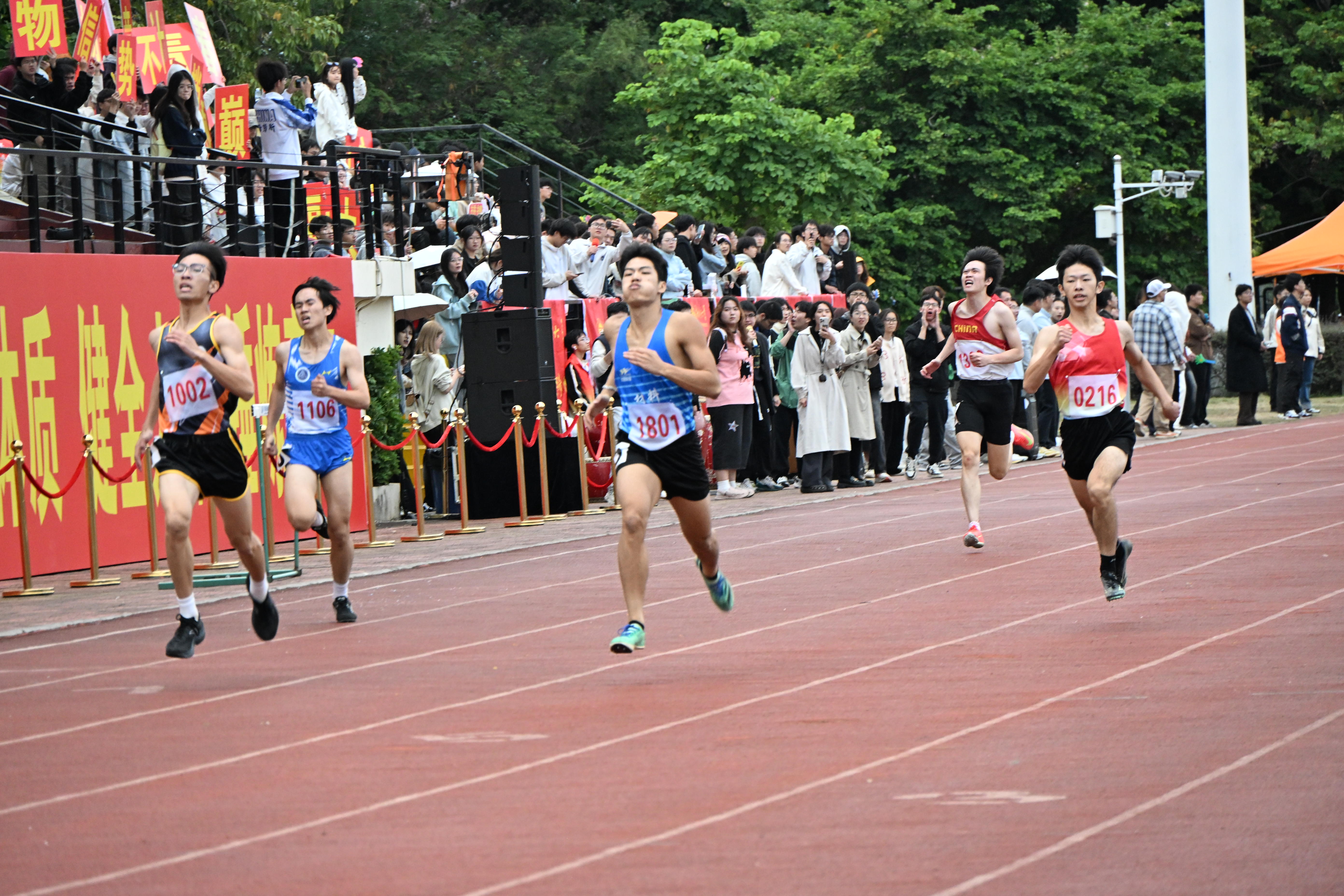 男子甲组七项全能第四项——400米比赛也在一区开赛。最终,材料学院林志宏以55秒8的成绩夺冠,计算机学院的郑钰榕以56秒1紧随其后,机械学院江志铨以56秒5位列第三。