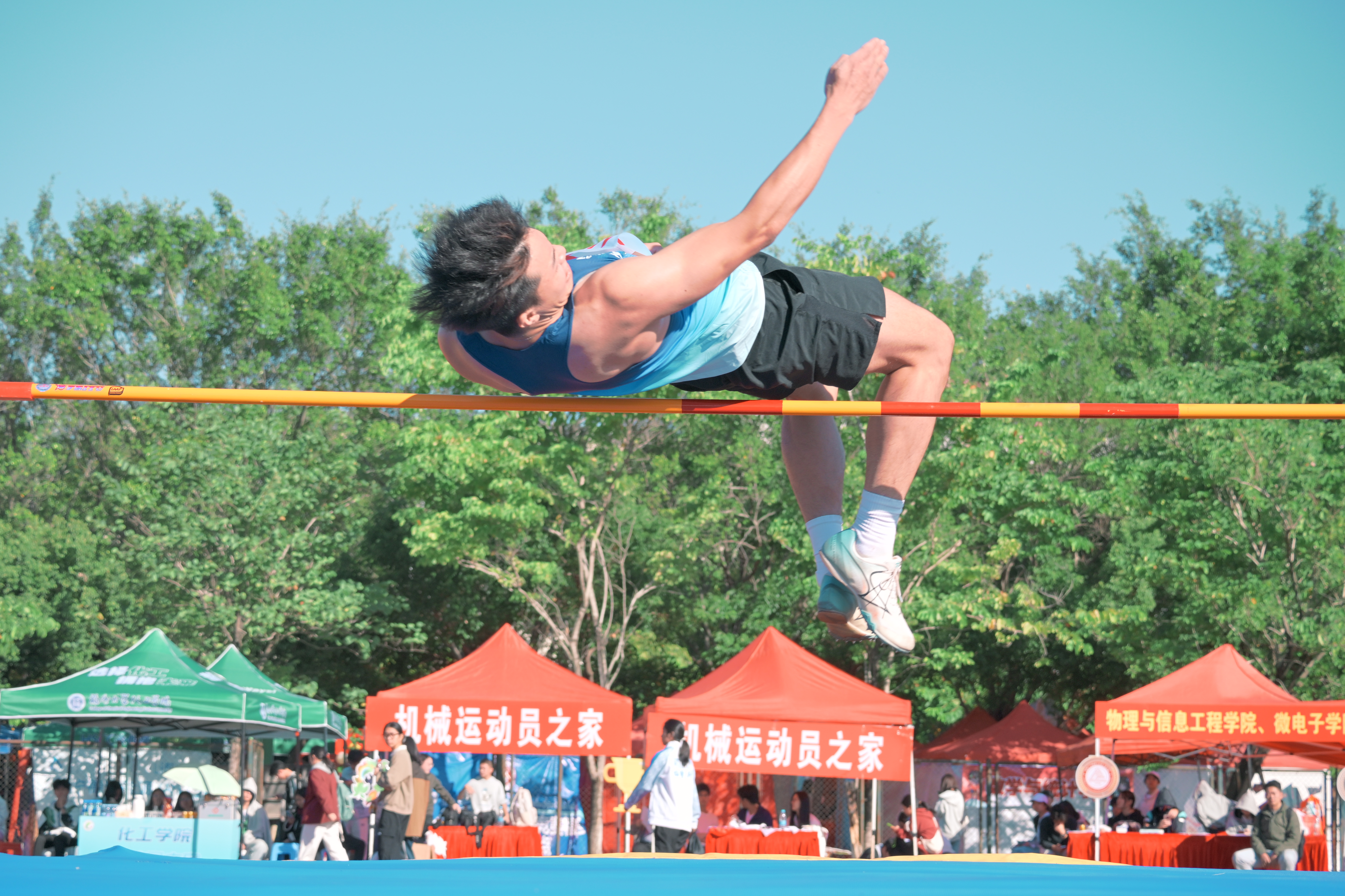 上午8点,男学甲跳高(七项之五)决赛在一区田径场进行,选手们助跑的蓄力、腾空的轻盈、落地的释然,都引得阵阵欢呼和掌声。赛事成绩揭晓,物信学院的林子涵、计算机学院的郑钰榕皆以1.75米的佳绩并列冠军,电气学院的林梓晗以1.66米位居亚军,材料学院的阮方浩以1.63米位居季军。