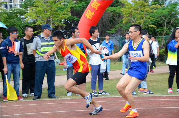 接力赛现场气氛热烈,选手们你追我赶,不分伯仲。比赛分为两组,在第一小组中,机关联队在第一棒便表现出优势,在之后的赛程中皆保持领先状态,特别地,工艺美院在第四棒中紧追不舍,最后仅以0.3秒落后于机关联队冲向终点。而在第二小组赛中,身着橙色运动服的经管学院老师们一直保持领先状态,毫无疑问地成为小组中第一支冲向终点红线的队伍。