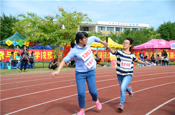 11月13日上午11时05分,女教青4*100接力决赛在一区操场进行,来自不同学院的13名女教师们齐聚赛场,为争夺冠军做最后一战。