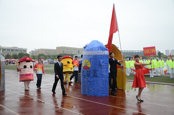 继承优良传统的石油化工学院依旧伴着他们的吉祥物——“小石”和“小化”入场,可爱的吉祥物守护了石化学院一年又一年,给了一代又一代的石化学子火热的激情和青春的朝气。“小石”和“小化”欢快地向主席台挥着小手,活泼的身姿也在传达着石化人灵动的气息。
