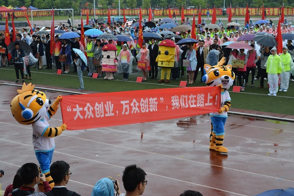 互联网+的时代下,李克强总理提出的“大众创业、万众创新”已在全国范围内掀起一段创业潮流,大学生创业成为越来越多人的选择。压轴出场的经济与管理学院代表队,充分将“互联网+”背景下的创新创业精神发挥到最大化。这次他们带着“创创虎”来到了跑道,憨态可掬的“创创虎”,伸展着幼圆的身体跳舞。演员们以“创创虎”为中心徐徐展开,随着音乐起舞,灵动柔美。两只可爱的创创虎意为“创新、创业”,在今年举办的首届中国“互联网+”大学生创新创业大赛中,学院两支创业团队脱颖而出,夺得银奖,是经管学院积极推进大学生创新创业教育取得的标志性成果。随着音乐演员们变换队形,为我们展示了双截棍、篮球、武术、花样跳绳四项运动。同时扇子组成了一把火炬,“创创虎”点燃了这把火炬,也点燃了经管学子的激情与梦想。