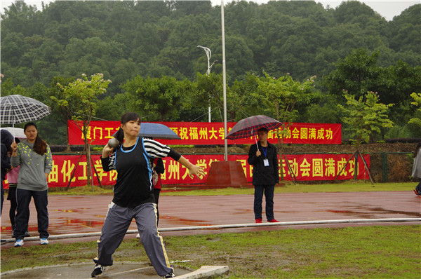 此时的雨正越下越大,然而冰冷的雨水却无法浇凉运动员们的热血,站在场边的健儿们不断地活动着关节,练习着自己习惯的投掷姿势,希望能取得优异的成绩。随着裁判员的口令,选手们陆续登场,铅球一次次在空中飞跃落地。来自经管学院的陈可欣选手一登场就投出9.11米的傲人成绩。令观众不禁惊呼连连,来自建筑学院的陈爽则以8.54米的成绩步步紧逼,有的选手因为雨水湿滑,导致在你投掷过程中铅球脱手,令人扼腕。各位运动员使出全身力气拼搏,使整场比赛精彩非常。