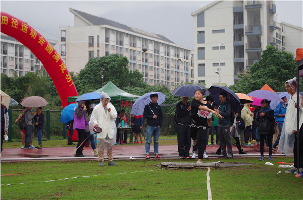 赛前,选手们在比赛场地旁摩拳擦掌,跃跃欲试,在飘飘细雨中轮番登场热身。其中,来自法学院的郑玉彤选手一身青绿色于东上衣格外显眼,铅球被她的手轻轻一推,犹如长出双翼般径直向外飞出,将远处的泥地砸出一个小坑。来自海洋学院的黄昕芯同学不甘示弱,以同样的成绩在第一次通知中与郑玉彤并驾齐驱,一旁的观众不由得大声喝彩。很快,比赛进入僵持阶段,郑玉彤选手顶住压力,持续发力,突出重围,领先其他选手。