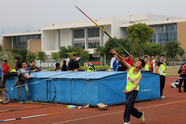 来自紫金学院的曾广圣是其中姿势相对标准的一位。他先助跑,然后侧身抛投,左脚猛地蹬地,右脚向前大迈一步,一个用力的甩腰,便把标枪投出。标枪划破苍穹,扎到地上,金属枪身还发出微微的震动。