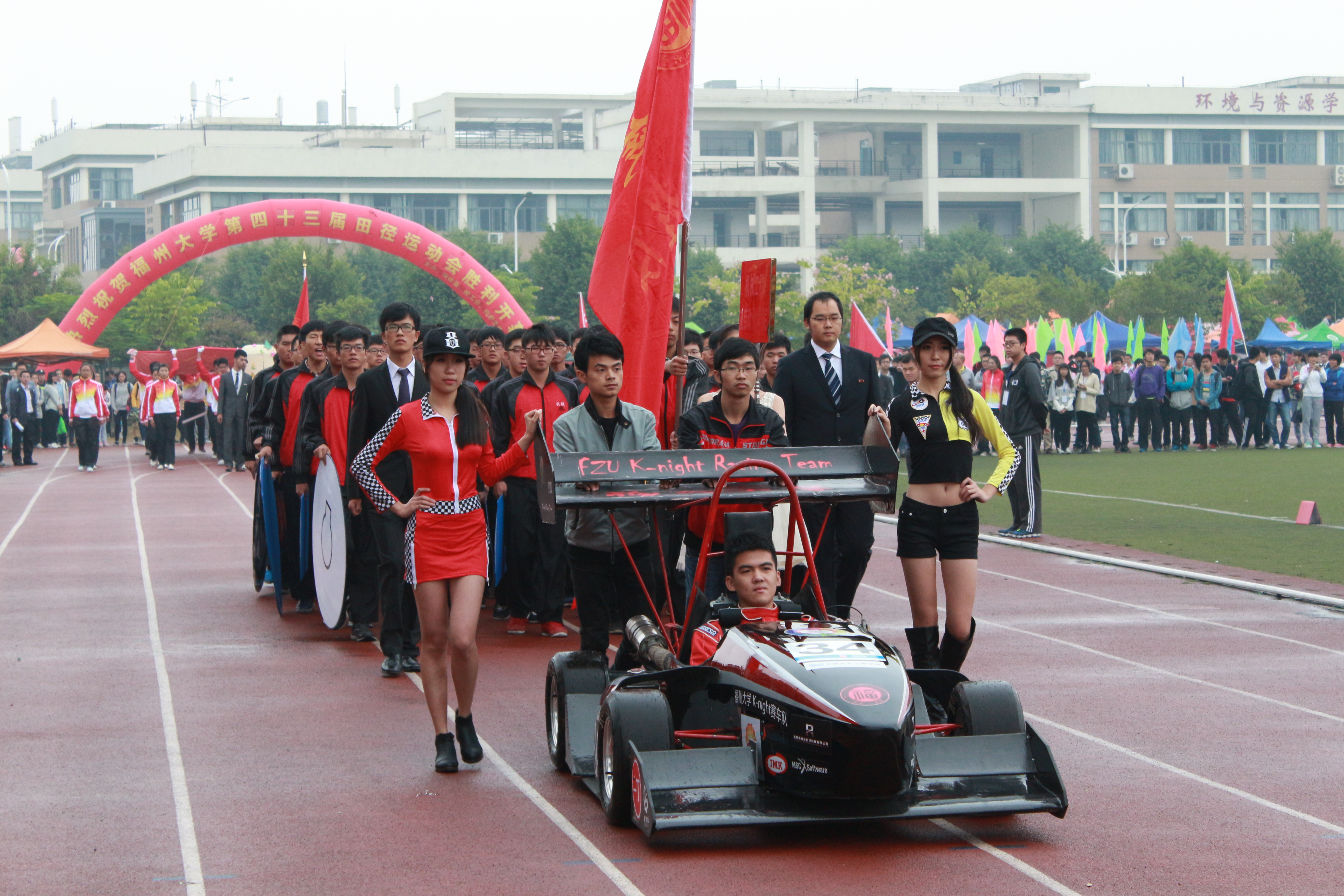 厦门工艺美院的代表队一入场便抓住了众人的眼球,马里奥的卡通人物形象,诙谐精彩的舞蹈,一首《超级玛丽》带领观众重温了童年的美好时光;紧接着入场的留学生方阵在热烈的掌声中入场,让留学生们感受到了中国学生们的热情。据悉,这是留学生首次单独组队参赛,包含了来自英国、德国、意大利、俄罗斯等14个国家的留学生;外国语学院充分体现了专业优势,代表队成员们身着各国的特色服装,中外文化的碰撞,形成运动会一道靓丽的剪影;而今年刚成立的石油化工学院,以其可爱的学院吉祥物小石与小化获得了不少人的青睐;阳光学子“破茧成蝶”以及精彩的舞龙表演让大家眼前一亮;机械学院带着今年参赛的K-night方程式赛车震撼出场,使得现场不少观众大呼其“帅气”!