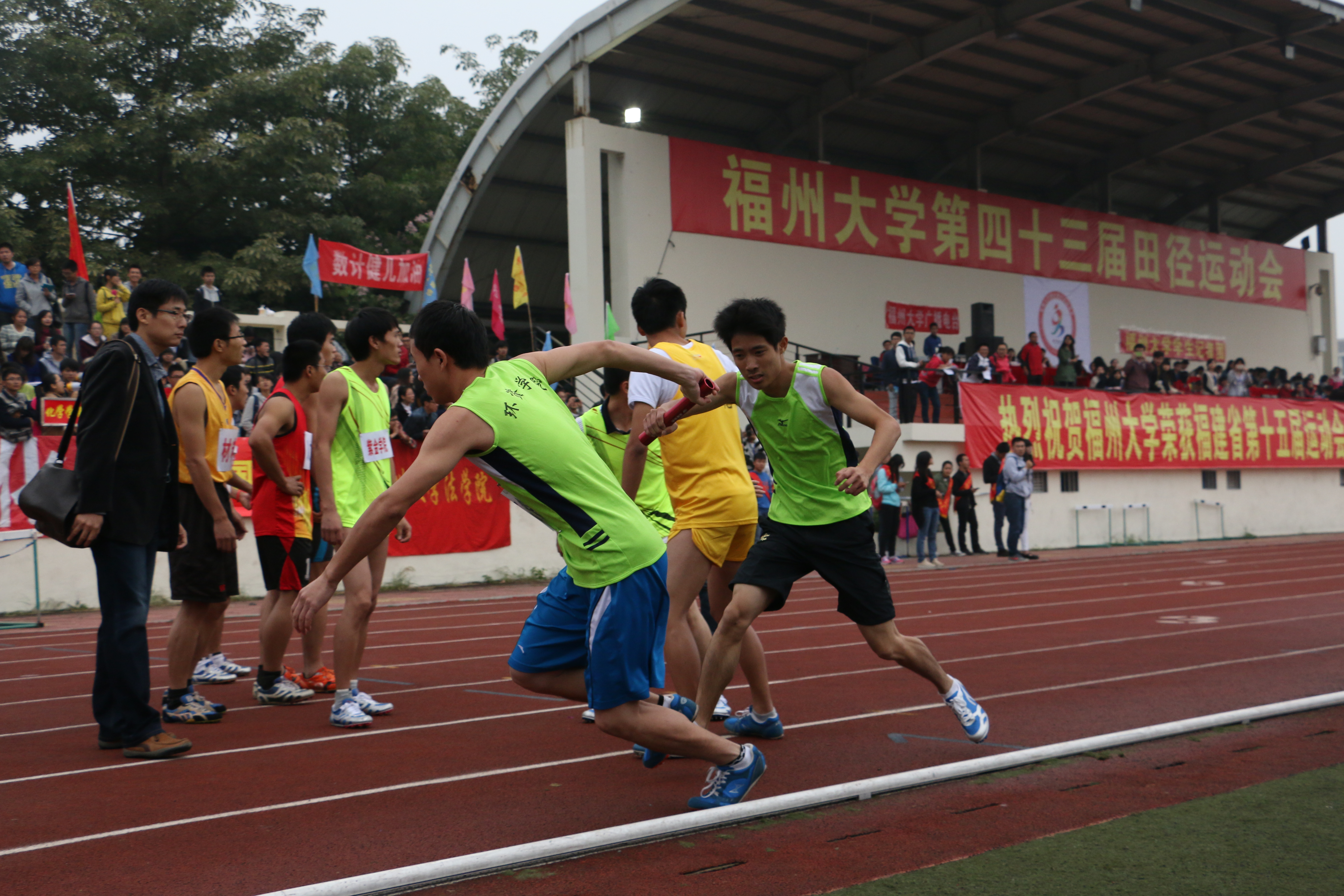 11月13日上午11:00,校运会男学乙4×400米接力比赛决赛在一区田径场举行。