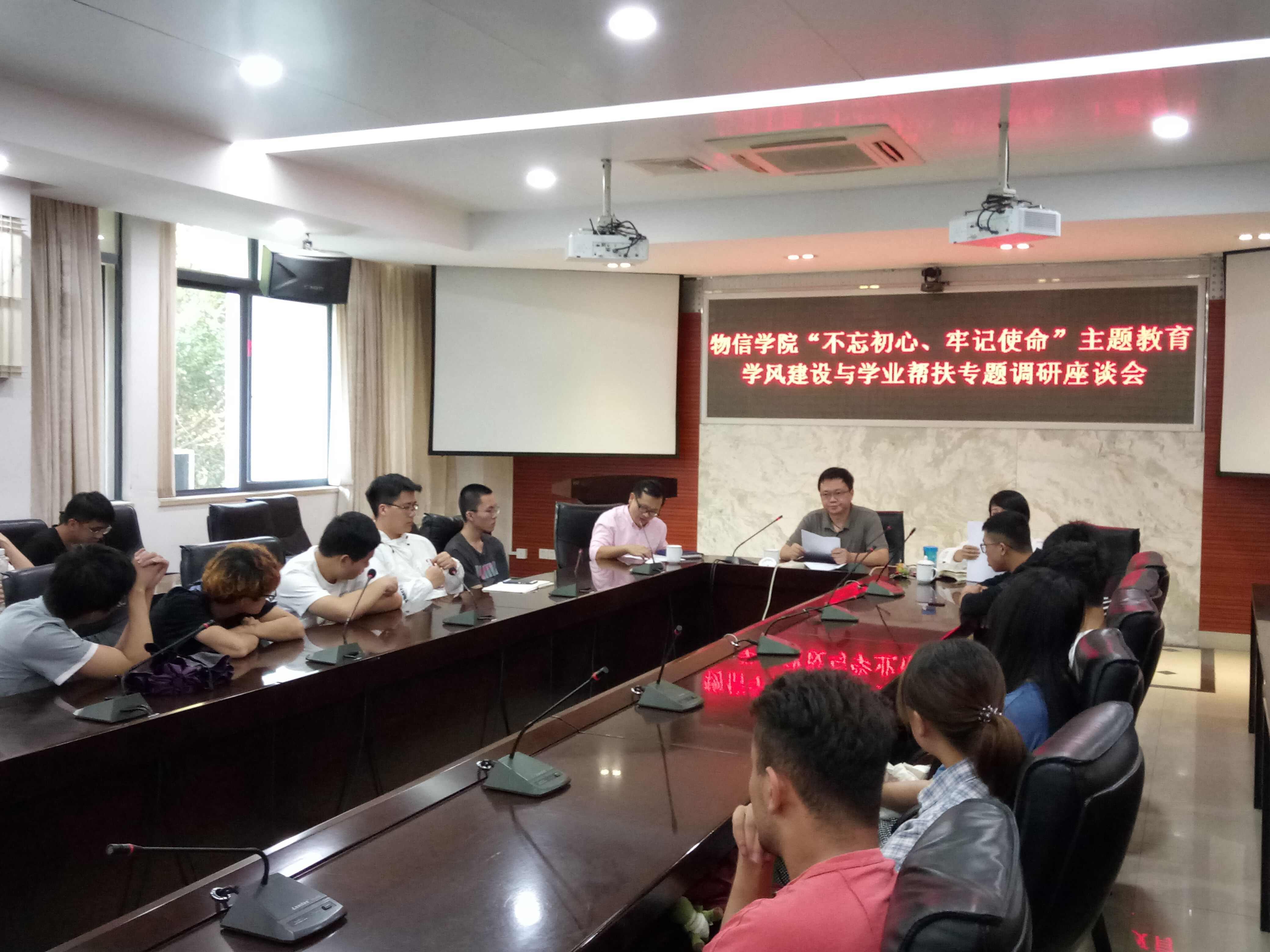 新闻中心讯/10月19日,福州大学物信学院“不忘初心、牢记使命”主题教育之学风建设与学业帮扶专题调研座谈会在学院祥联厅举行,会议由院党委吴唐风副书记主持,本次调研座谈主要面对的是本科2017级学业达到预警及劝退状态的学生代表,参与调研座谈会的还有2017级辅导员以及2017级参与过学业后进学生学业帮扶的“学科助手”代表。