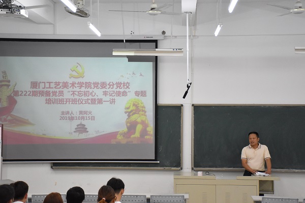 新闻中心讯/10月15日晚,福州大学厦门工艺美术学院党委分党校第222期预备党员“不忘初心、牢记使命”专题培训班开班仪式暨第一讲于公教2#304举行。此次由学院党委书记黄阿火主讲,主题为“不忘初心、牢记使命,深刻领会习近平新时代中国特色社会主义思想”。