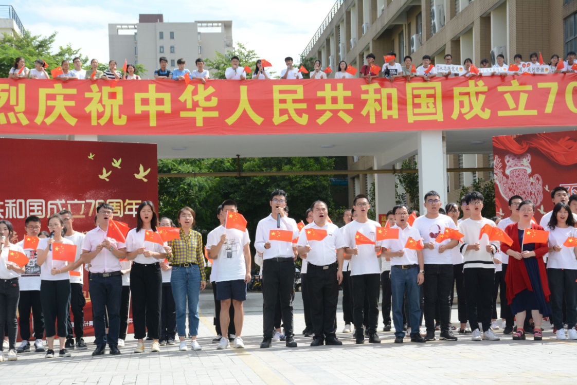 新闻中心讯/ 国庆期间,福州大学数学与计算机科学学院开展了“我为祖国点赞”主题教育。10月1日上午,在数计学院院楼小广场,数计学院开展“诵诗吟歌献礼祖国”快闪活动。活动现场,所有参与活动的师生热情挥舞手中的小红旗,深情朗诵诗歌《盛世中国》、摆出 “70阵列”造型、合唱歌曲《龙的传人》,以新时代青年大学生的特有方式热烈庆祝中华人民共和国成立70周年。