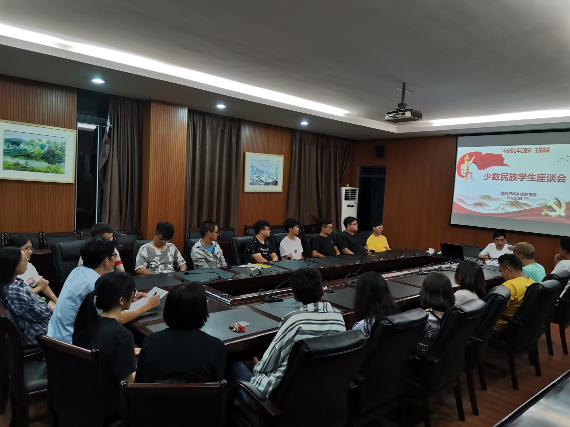 新闻中心讯/为进一步贯彻落实“不忘初心、牢记使命”主题教育,加强与少数民族学生的沟通与交流, 9月25日晚上,建筑与城乡规划学院党委在学院213会议室召开少数民族学生交流座谈会。座谈会由学院党委书记陈小辉主持,学院党委副书记陈德铭、党委组织员出席了座谈会。