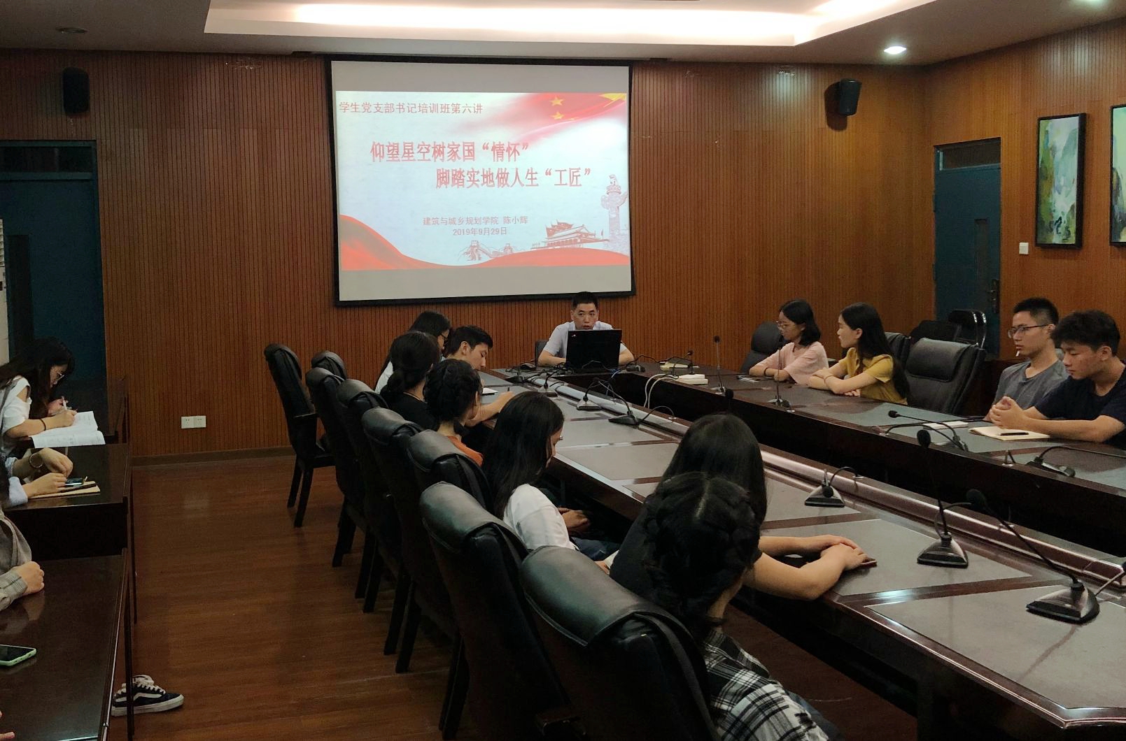 新闻中心讯/9月29日晚,建筑学院党委书记陈小辉以“仰望星空树家国‘情怀’,脚踏实地做人生‘工匠’”为题,为建筑学院学生党支部书记和所联系的2016级各班级党支部的党员上了一堂精彩的主题党课。