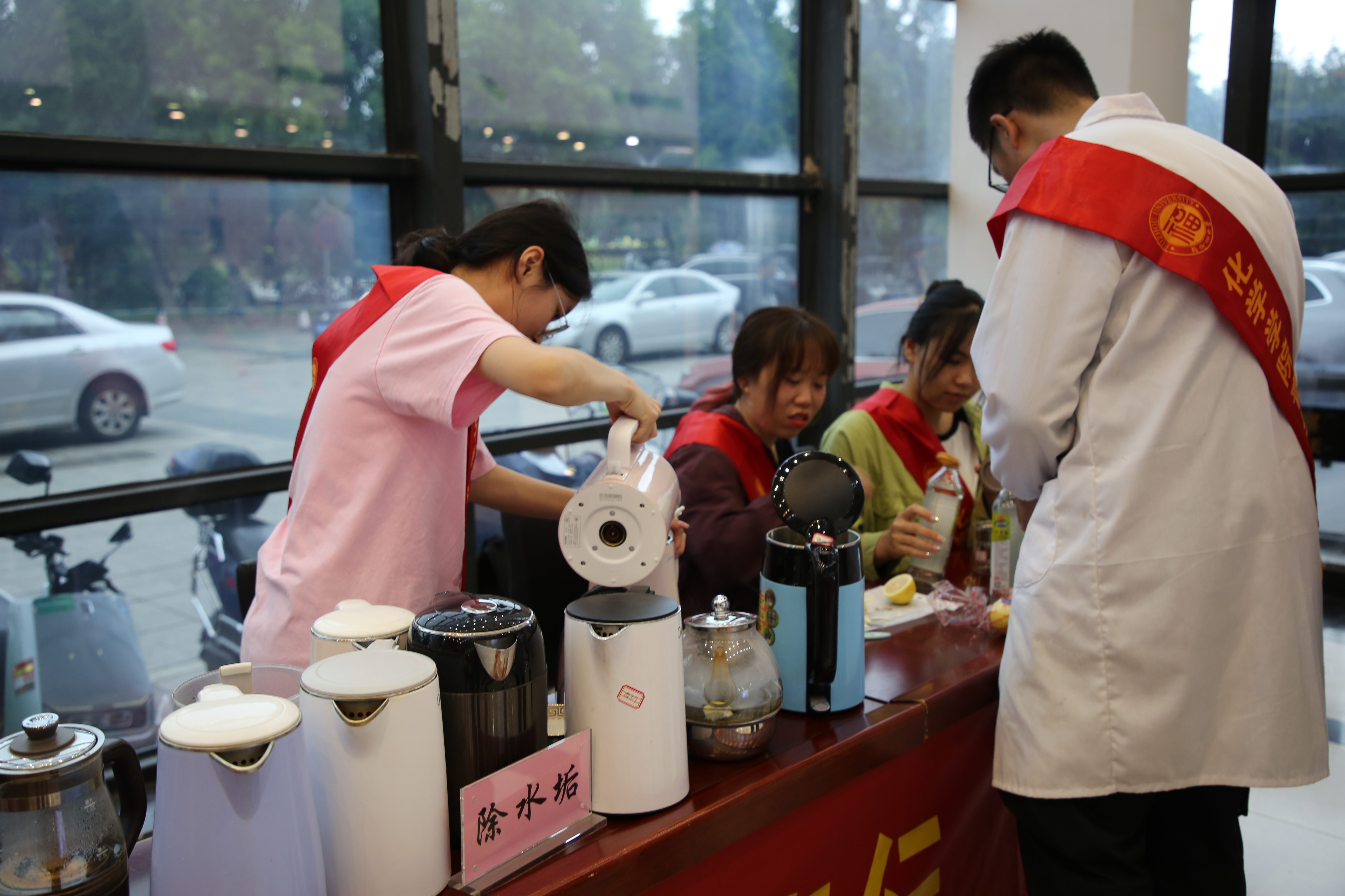 活动现场,机关党委组织党员志愿者和学生志愿者负责现场维护秩序、引导水壶清洗登记等工作,还设置了节水节能宣传点、校庆祝福打卡点,并通过视频展播机关党员志愿服务情况,宣传健康生活知识。化学学院学生志愿者运用所学专业知识为师生服务,帮助到场师生为水壶除污去垢,现场共计清理水壶46个,发放宣传手册和叶脉书签60张。